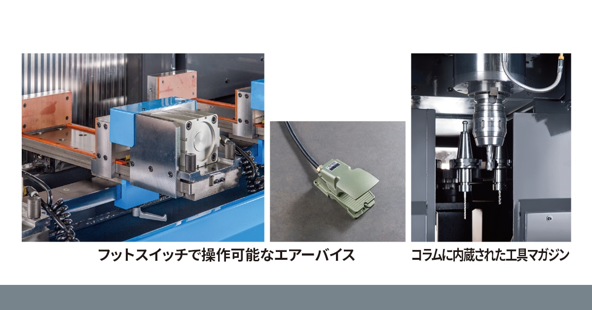 フットスイッチでワーク着脱ができるエアーバイスを標準搭載。従来機よりも長手方向の早送り速度を67%向上、ATCの工具交換速度を30%向上させました。