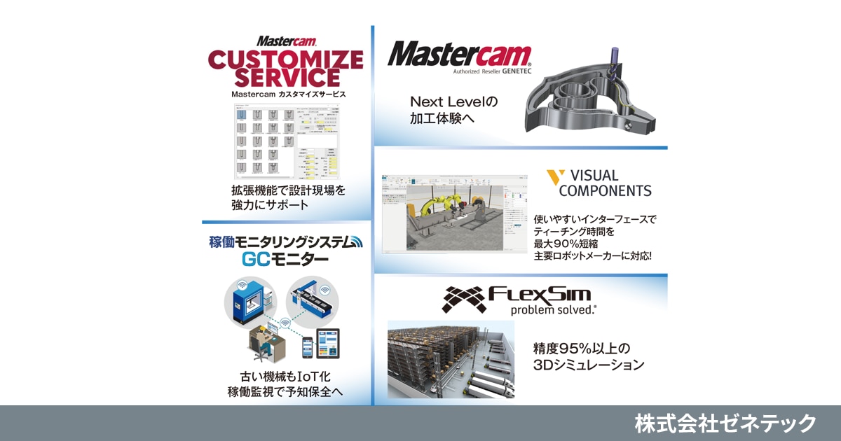 ほかにも、工作機械の稼働状況を遠隔監視し、予防・予知保全につなげるIoTソリューション「GCモニター」や、工場の生産ラインや物流倉庫などのレイアウトを、超軽量3Dグラフィックを用いて仮想空間上で再現し、ボトルネックや投資対効果を可視化することで生産性を大幅に向上させる3Dシミュレーションソフト「FlexSim」を正規輸入元として提供。国内製造業・物流業の導入が急伸しています。