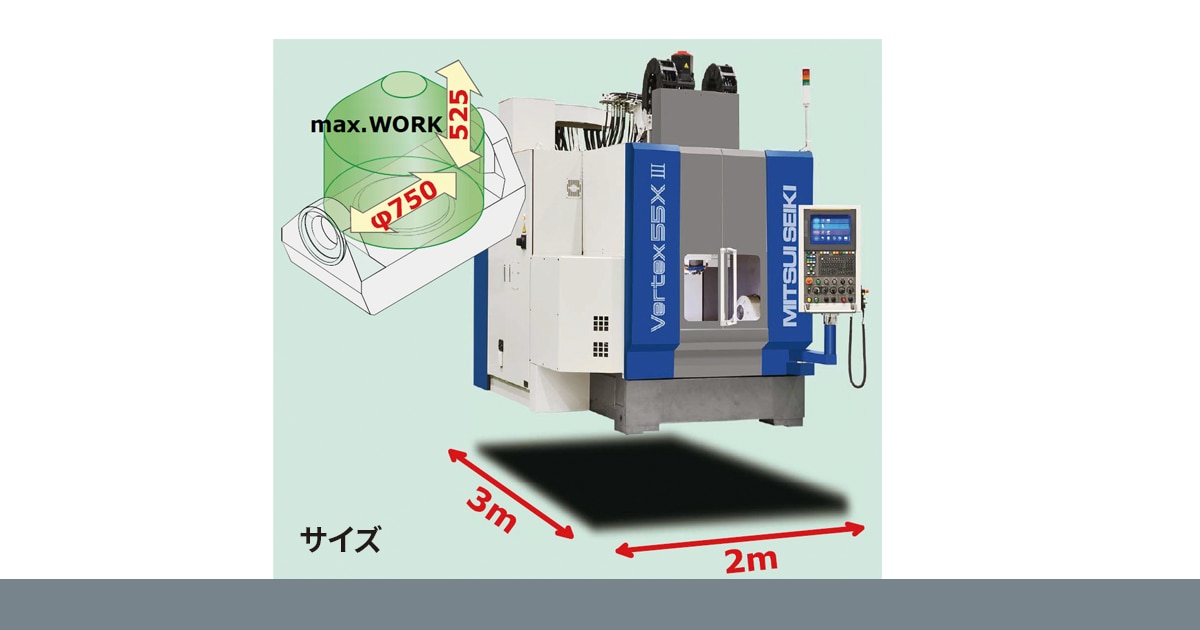 Vertex 55X Ⅲは2×3mのコンパクトな設置面積にもかかわらず最大径750㎜、高さ525㎜のワークが積載可能。