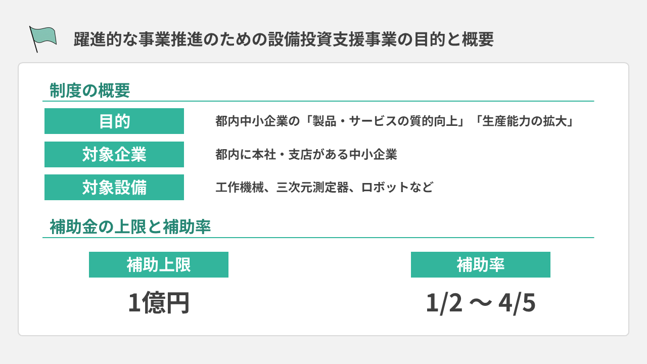 ここで改めて、躍進的な事業推進のための設備投資支援事業の概要を見ていきます。この補助金は、都内に本社や支店がある中小企業の「製品・サービスの質的向上」や、「生産能力の拡大」のために必要な機械設備・ソフトウェア投資を支援する制度です。特に製造業においては、工作機械や検査装置、ロボットなどの導入に使用されています。