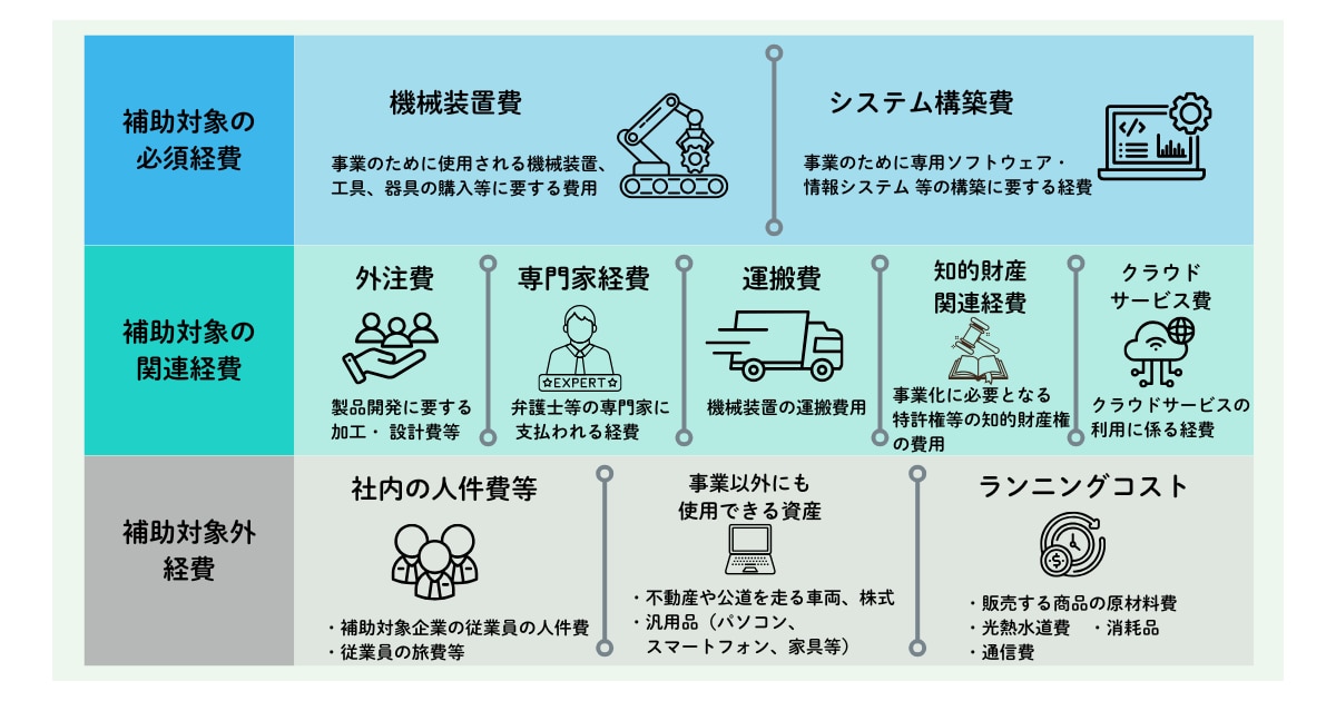 この必須経費に関連する経費として、5つの項目が補助対象となりますが、基本的には上記の機械装置・システム構築費に関連する経費である必要があります。