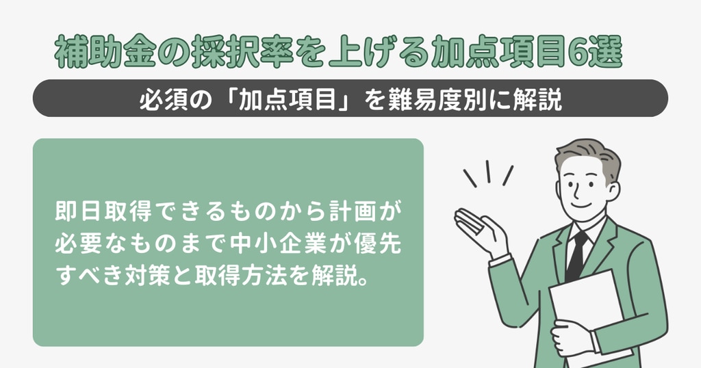記事を見る補助金の採択率アップに必須の「加点項目」6選を難易度別に解説。即日取得できるものから計画が必要なものまで、中小企業が優先すべき対策と取得方法をまとめました。