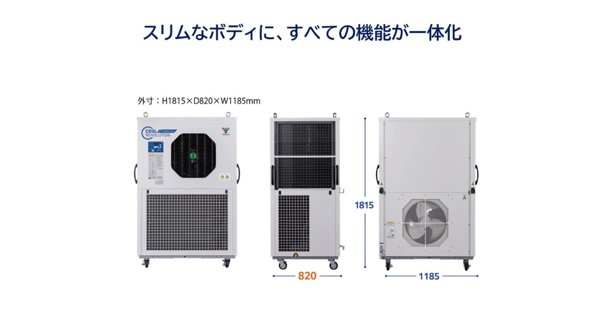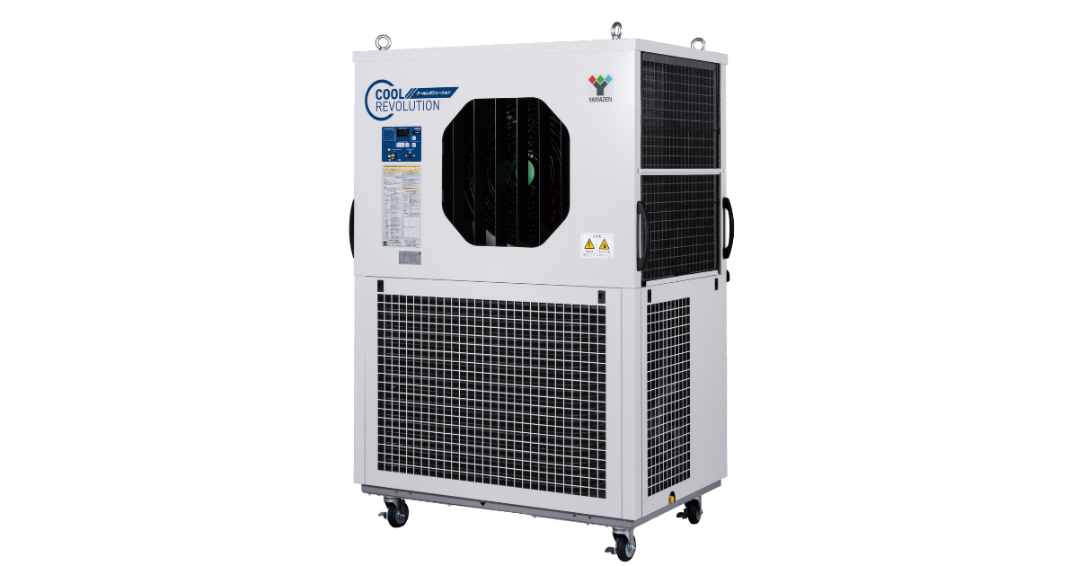 クールレボリューションは、工場・大型倉庫など広大な空間での使用を想定して開発された、移動式大風量スポットクーラーです。